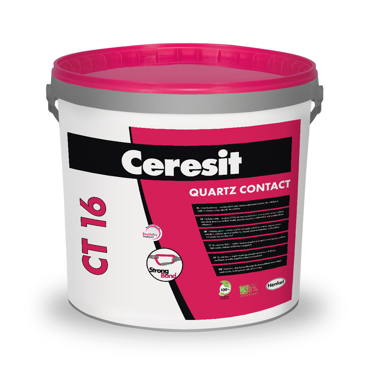 Preparat Ceresit CT 16 ułatwia nakładanie cienkowarstwowych tynków oraz „przecierek” stosowanych na zewnątrz i wewnątrz budynków. Jest zalecany do gruntowania warstwy zbrojonej siatką przy ocieplaniu budynków metodą lekką-mokrą w systemach ociepleń Ceresit Ceretherm oraz do tradycyjnych tynków. Polecany też pod tynki mozaikowe. Preparatem CT 16 można pokrywać powierzchnie płyt wiórowych, gipsowo kartonowych, lamperii, tynków gipsowych, wszelkich betonów i mocnych powłok malarskich. Zagruntowanie podłoża preparatem CT 16 zdecydowanie zmniejsza jego nasiąkliwość, co zapobiega zbyt szybkiemu przesychaniu nakładanych potem materiałów, pozwalając wydłużyć czas otwarty nawet o 3 minuty przy temperaturze ok. 25°C. Zawarte w CT 16 drobne kruszywo czyni gruntowane powierzchnie szorstkimi i odpornymi na zarysowanie. Rozwija powierzchnię, przez co zwiększa przyczepność tynków, szpachlówek i farb. Szybkoschnący - czas schnięcia tylko 3 godziny. Materiał ma dużą siłę krycia i skutecznie ujednolica podłoże, zapobiegając powstawaniu plam na kolorowych tynkach akrylowych, mineralnych, silikatowo-silikonowych, silikonowych i elastomerowych. Grunt CT 16 może stanowić również warstwę ochronną, w przypadku kiedy niemożliwe jest kontynuowanie prac ze względu na okres zimowy. Jeśli prace wznawiane są po okresie dłuższym niż pół roku, zaleca się ponowienie aplikacji.. Do powierzchniowego wzmacniania nasiąkliwych podłoży należy stosować preparat Ceresit CT 17.