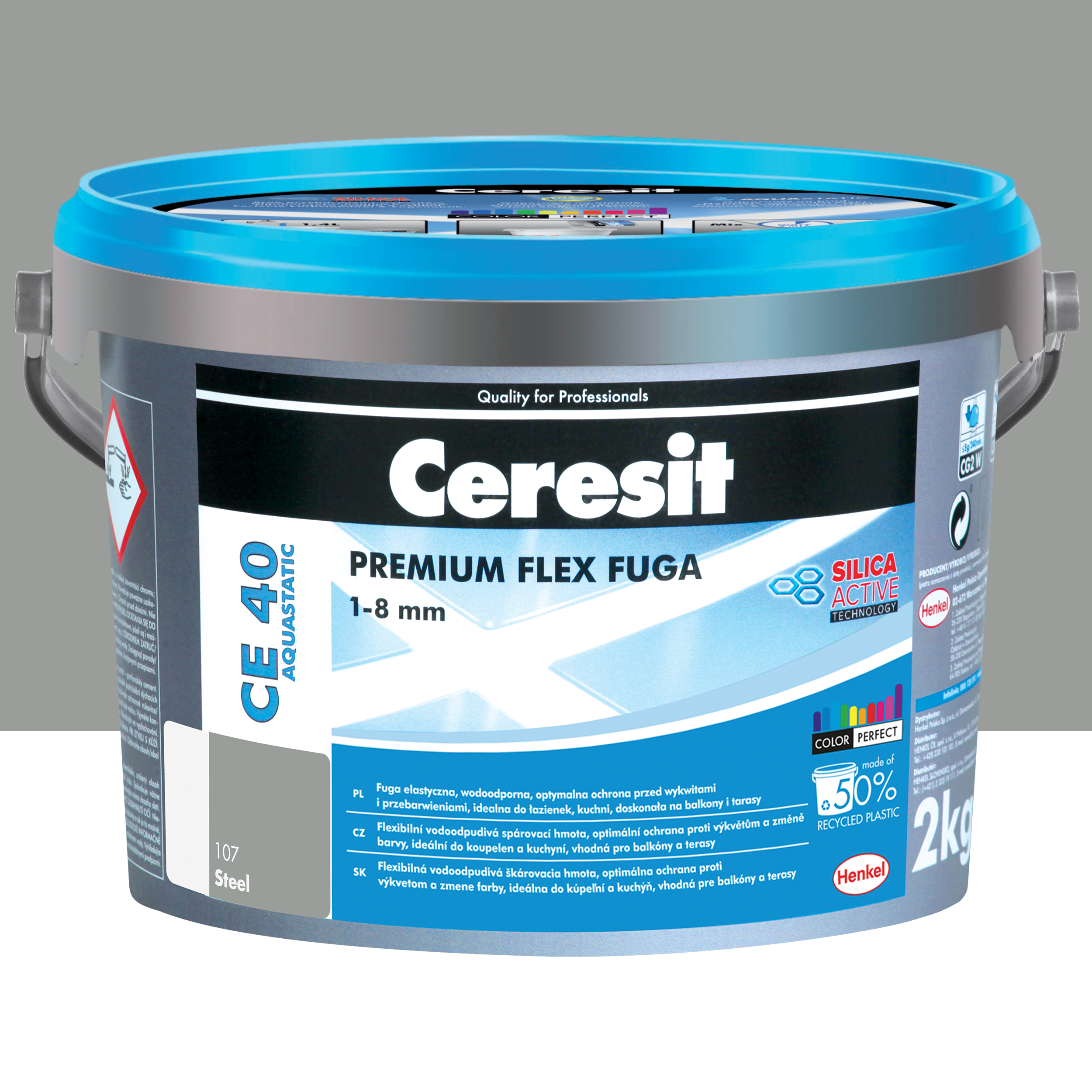 Dzięki Technologii Silica Active spoina CE 40 steel posiada optymalny czas wiązania i mycia w płytkach gresowych i ceramicznych. Specjalne wiązania oraz doskonała przyczepność do płytek zapewniają wysoką odporność na pęknięcia i ścieranie. CE 40 steel z technologią Silica Active to trwały i intensywny kolor bez wykwitów na długie lata. Zaprawa Ceresit CE 40 steel służy do spoinowania płytek gresowych, innych typów płytek ceramicznych, szklanych oraz kamiennych (również marmurów), zarówno na powierzchniach pionowych i poziomych. Potrójna Ochrona MicroProtect – formuła zawiera 3 specjalnie dobrane substancje czynne, które zapewniają długą i skuteczną ochronę przeciw grzybom i pleśniom. Formuła chroni nie tylko samą spoinę, lecz również przyległe do niej powierzchnie płytek (strefa inhibicji), zapewniając estetyczny wygląd okładziny ceramicznej. Efekt Aquastatic – powierzchniowe uszczelnienie spoiny (hydrofobizacja) powoduje, że krople wody utrzymują się w formie perełek na powierzchni fugi, co wydłuża znacząco działanie pleśniobójcze oraz chroni fugę przed zabrudzeniami. Zalety te umożliwiają eksploatacje spoiny w miejscach szczególnie narażonych na okresowe działanie wody np. łazienki, prysznice, kuchnie. Może być stosowana wewnątrz i na zewnątrz budynków. Szczególnie polecana, gdy płytki mocowane są na podłożach odkształcalnych: ogrzewane podłogi, płyty wiórowe i gipsowo-kartonowe. Wodoszczelność i odporność na oddziaływanie chemikaliów zapewnia stosowanie fugi Ceresit: CE 79. Dylatacje między płytkami, spoiny w narożach ścian, w połączeniach ścian z posadzką i przy urządzeniach sanitarnych należy wypełnić silikonem Ceresit CS 25 MicroProtect, a w przypadku spoinowania marmurów CS 29. W celu dodatkowego zabezpieczenia spoin i okładzin ceramicznych przed zabrudzeniami poprzez hydrofobizację, należy stosować silikonowy impregnat Ceresit CT 10.