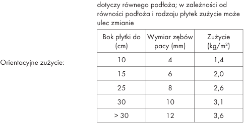 Zużycie kleju pod płytki jest zależne od rozmiaru płytek oraz wymiaru zębów w pacy. Przy nierównych podłożach zużycie kleju do płytek na m2 również może się zwiększyć. Podłoże przed układaniem płytek powinno zostać odpowiednio wyrównane. Jeśli płytki są układane na powierzchniach betonowych można zastosować produkty PCC do naprawy betonu. Średnie zużycie kleju do płytek na m2 wynosi od 1,4 do 3,6 kg/m2. Im większy rozmiar płytki i wielkość zębów pacy tym zużycie jest wyższe.