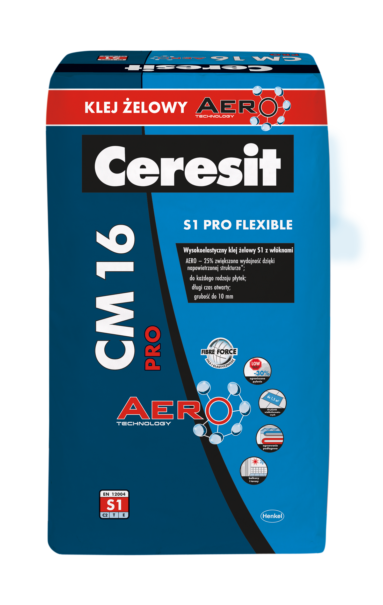 Ceresit CM 16 PRO to wysokiej jakości żelowy klej do płytek, o podwyższonej wydajności ze względu na formułę AERO. Formuła podwyższa wydajność o ok 25% ze względu na napowietrzoną strukturę. Dzięki technologii AERO klej jest lżejszy i bardziej wydajny, co przekłada się na niższe zużycie kleju pod płytki i większy komfort pracy. Natomiast formuła LOW DUST obniża pylenie zaprawy klejącej o 30% poprawiając parametry robocze. CM16 PRO jest klejem do płytek wielkoformatowych o powierzchni do 1,5m2.