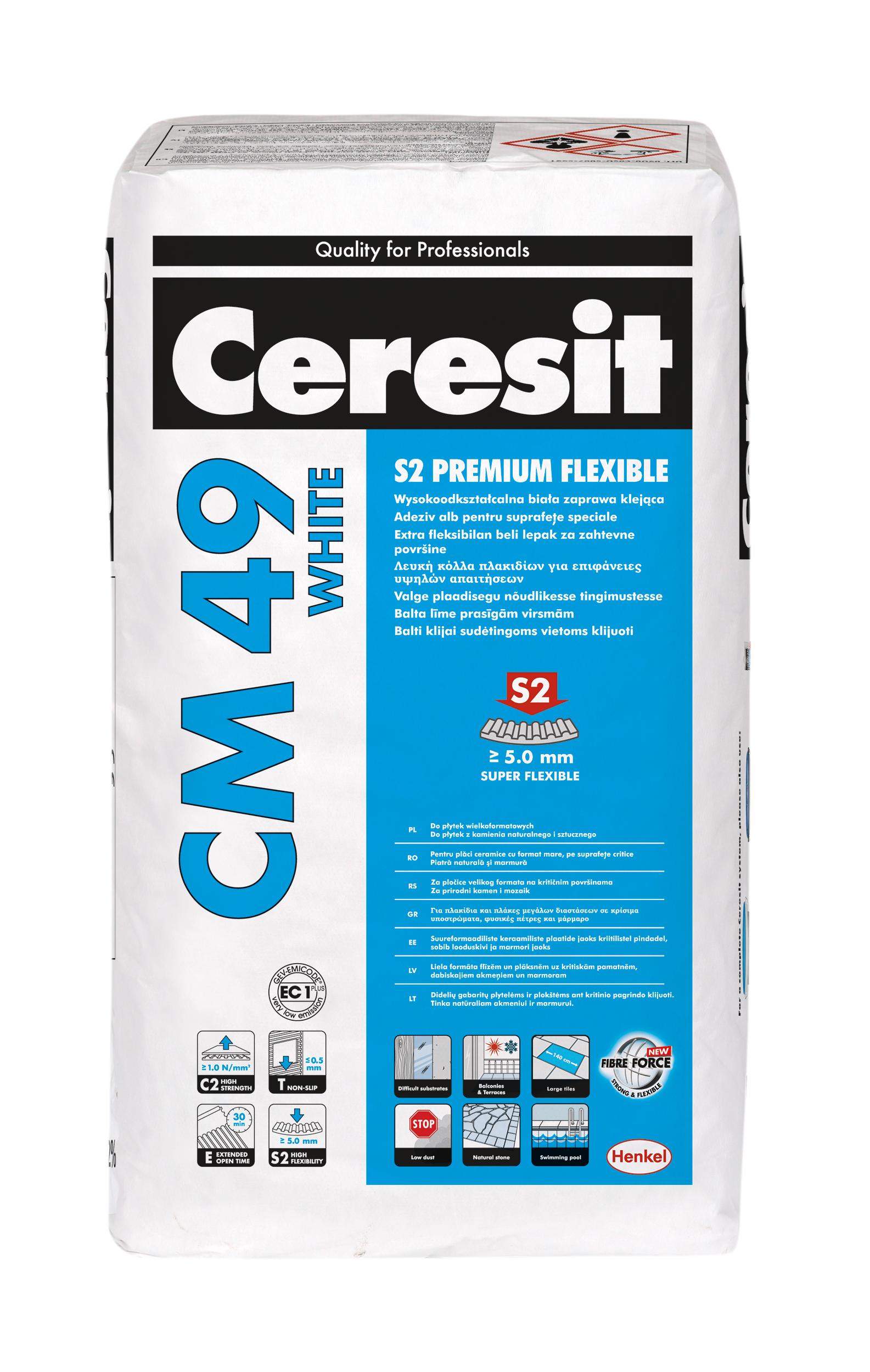 Zaprawa Ceresit CM 49 służy do przyklejania płytek marmurowych, granitowych, trawertynu, konglomeratu, jasnych wapieni, z piaskowca i innych skał gruboziarnistych niewrażliwych na przebarwienia. Nadaje się również do klejenia płytek ceramicznych, gresowych, glazury, terakoty oraz wszelkich odmian mozaiki np. szklanej i ceramicznej. Dzięki wysokie odkształcalności – klasa S2, możliwe jest przyklejanie płytek wielkoformatowych jak również spieków kwarcowych. Zaprawę można stosować wewnątrz i na zewnątrz budynków, na podłożach krytycznych, gdzie wymagana jest wysoka odkształcalność. Może być stosowany na tarasach, balkonach, schodach, ogrzewanych podłogach, elewacjach w basenach, zbiornikach na wodę jak również na płytach OSB oraz na istniejącej już okładzinie ceramicznej (tylko wewnątrz pomieszczeń). Sprawdza się również w miejscach narażonych na intensywny ruch oraz obciążenia użytkowe takich jak: ciągi komunikacyjne, korytarze, szkoły, markety, sklepy, restauracje itp. Dzięki zawansowanej formule LOW DUST pozwala na wykonywanie prac z zachowaniem maksymalnej czystości.