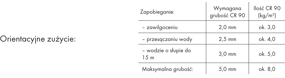 Powłoka Ceresit CR 90 służy do przeciwwilgociowego oraz przeciwwodnego uszczelniania nieodkształcalnych podłoży mineralnych. Zaprawa Ceresit CR 90 tworzy powłokę uszczelniającą na powierzchni podłoży. Dodatkowo, w trakcie eksploatacji obiektu, krystalizuje w porach podłoża. Nierozpuszczalne w wodzie sole wnikają w strukturę porów kapilarnych betonu, gdzie tworzą tzw. jądra krystalizacji. Stopniowo dochodzi do narastania kryształów, aż do zamknięcia światła kapilar, co prowadzi do zaniku transportu wody w obydwu kierunkach. Krystalizacja stanowi więc dodatkowe zabezpieczenie podłoża w przypadku lokalnego uszkodzenia powłoki lub pęknięcia powłoki wywołanego inicjacją rys statycznych. Ceresit CR 90 może być stosowana jako izolacja balkonów, cokołów, podziemnych części budowli w tym ścian piwnic, oczyszczalni ścieków, zbiorników na wodę (także na wodę pitną), w których głębokość słupa wody nie przekracza 15 m, zbiorników p.poż, technologicznych, małych monolitycznych niecek basenowych do 20 m2. CR 90 skutecznie zabezpiecza przed wodą i wilgocią konstrukcje żelbetowe, betonowe i murowe wykonane na pełną spoinę, a także powierzchnie cementowych tynków. Powłoka Ceresit CR 90 może być stosowana od strony pozytywnego (do 15 m słupa wody) i negatywnego (do 5 m słupa wody) parcia wody. W miejscach kompensacji naprężeń wymagane jest dozbrojenie powłoki poprzez zastosowanie taśmy Ceresit CL 152 lub Ceresit CL 62. Jeżeli CR 90 będzie narażona na oddziaływania mechaniczne, np. na ruch pieszy, należy ją osłonić np. poprzez wykonanie posadzki, tynku niezawierającego gipsu albo mocować płytki ceramiczne zaprawami Ceresit CM. Na podłożach odkształcalnych należy stosować elastyczne materiały: Ceresit CR 166, CL 50, CL 51. Do tamowania lokalnych sączeń wody można zastosować materiał CX 5. Do uszczelniania tarasów oraz powierzchni z ogrzewaniem podłogowym należy stosować izolację Ceresit CR 166. Powłoka Ceresit CR 90 spełnia wymagania izolacji typu lekkiego, średniego i ciężkiego.