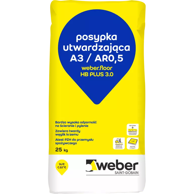 weber.floor HB PLUS 3.0 jest przeznaczony do wykonywania zacieranych, odpornych na ścieranie, monolitycznych posadzek betonowych metodą „suche na mokre”. Wyrób przeznaczony do stosowania w magazynach, fabrykach, zakładach przemysłowych, warsztatach, centrach handlowych oraz na innych powierzchniach naraż-nych na średnie obciążenia mechaniczne.