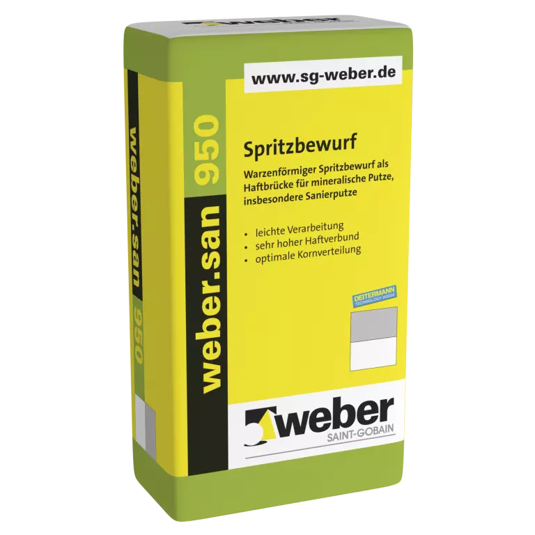 weber.san 950 (Deietermann AS) jest specjalną, hydraulicznie wiążącą zaprawą stosowaną jako obrzutka poprawiająca przyczepność pod tynki.