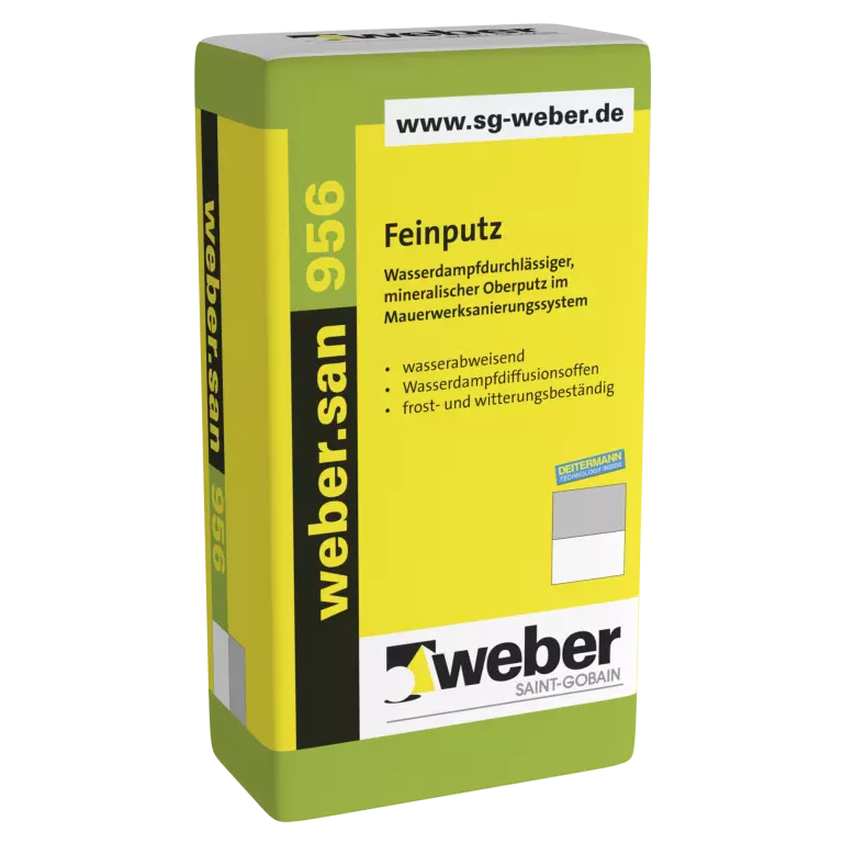 weber.san 956 (Deitermann FP) jest dyfuzyjnym, drobnoziarnistym tynkiem mineralnym do zastosowań zewnętrznych i wewnętrznych.
