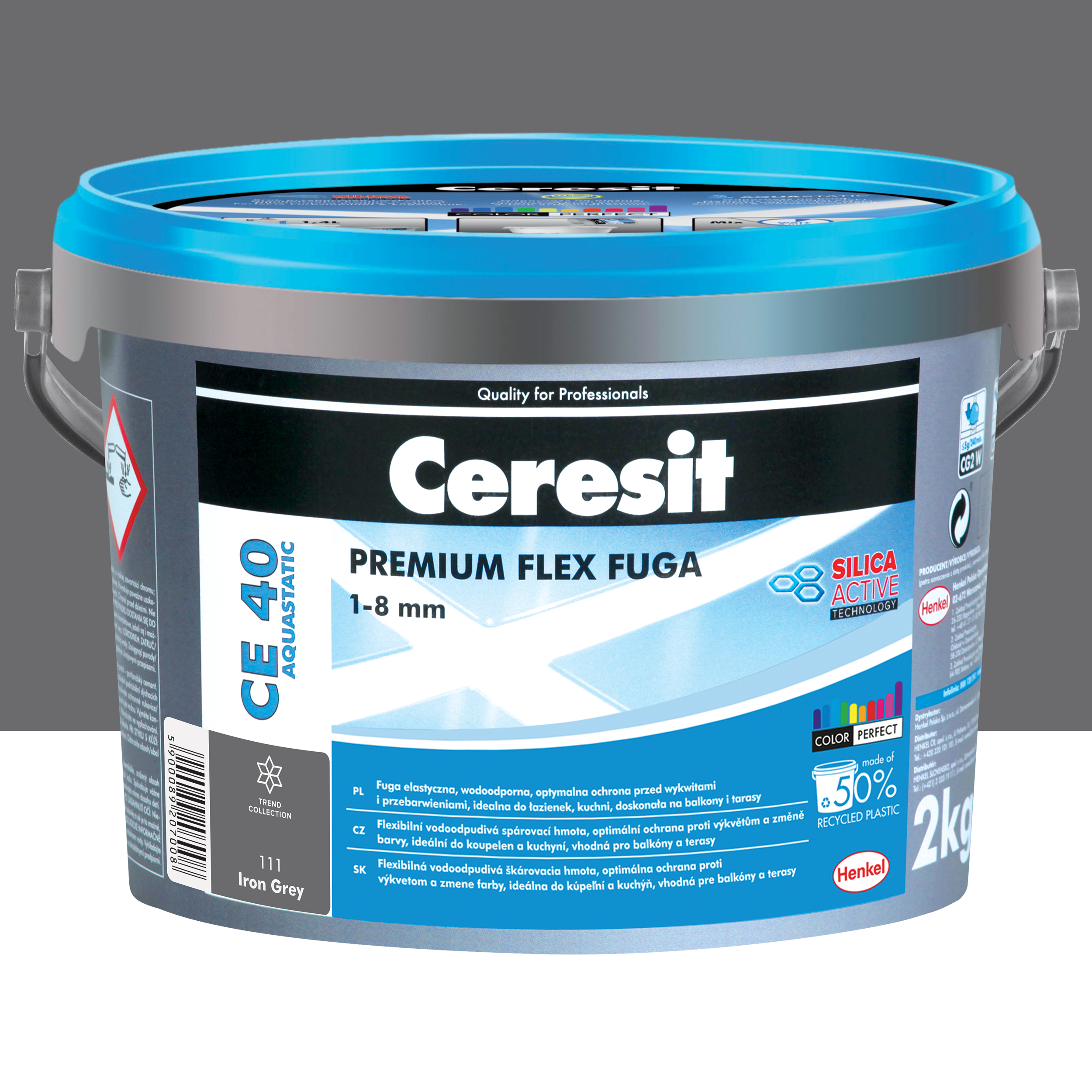 Dzięki Technologii Silica Active spoina CE 40 irongrey posiada optymalny czas wiązania i mycia w płytkach gresowych i ceramicznych. Specjalne wiązania oraz doskonała przyczepność do płytek zapewniają wysoką odporność na pęknięcia i ścieranie. CE 40 irongrey z technologią Silica Active to trwały i intensywny kolor bez wykwitów na długie lata. Zaprawa Ceresit CE 40 irongrey służy do spoinowania płytek gresowych, innych typów płytek ceramicznych, szklanych oraz kamiennych (również marmurów), zarówno na powierzchniach pionowych i poziomych. Potrójna Ochrona MicroProtect – formuła zawiera 3 specjalnie dobrane substancje czynne, które zapewniają długą i skuteczną ochronę przeciw grzybom i pleśniom. Formuła chroni nie tylko samą spoinę, lecz również przyległe do niej powierzchnie płytek (strefa inhibicji), zapewniając estetyczny wygląd okładziny ceramicznej. Efekt Aquastatic – powierzchniowe uszczelnienie spoiny (hydrofobizacja) powoduje, że krople wody utrzymują się w formie perełek na powierzchni fugi, co wydłuża znacząco działanie pleśniobójcze oraz chroni fugę przed zabrudzeniami. Zalety te umożliwiają eksploatacje spoiny w miejscach szczególnie narażonych na okresowe działanie wody np. łazienki, prysznice, kuchnie. Może być stosowana wewnątrz i na zewnątrz budynków. Szczególnie polecana, gdy płytki mocowane są na podłożach odkształcalnych: ogrzewane podłogi, płyty wiórowe i gipsowo-kartonowe. Wodoszczelność i odporność na oddziaływanie chemikaliów zapewnia stosowanie fugi Ceresit: CE 79. Dylatacje między płytkami, spoiny w narożach ścian, w połączeniach ścian z posadzką i przy urządzeniach sanitarnych należy wypełnić silikonem Ceresit CS 25 MicroProtect, a w przypadku spoinowania marmurów CS 29. W celu dodatkowego zabezpieczenia spoin i okładzin ceramicznych przed zabrudzeniami poprzez hydrofobizację, należy stosować silikonowy impregnat Ceresit CT 10.