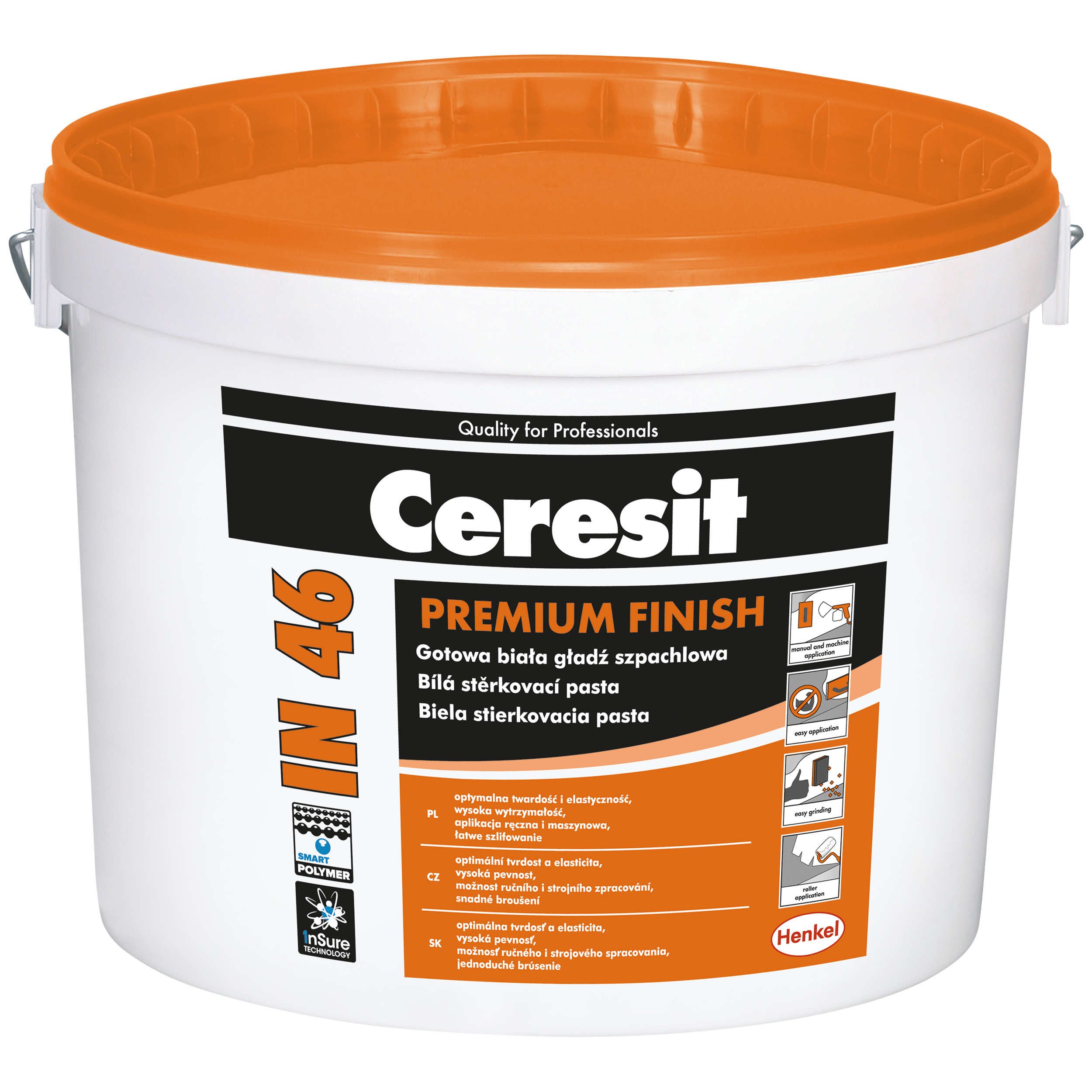 Biała, gotowa gładź szpachlowa Ceresit IN 46 służy do wykonywania gładkich powierzchni ścian oraz sufitów, pod malowanie i tapetowanie. Po całkowitym związaniu tworzy elastyczne, trwałe, zwarte oraz stabilne podłoże. Dzięki zastosowaniu technologii 1nSure oraz specjalnych wypełniaczy SMART POLYMER pozwala na uzyskanie idealnie gładkiej oraz wytrzymałej powierzchni. Materiał jest gotowy do użycia, bardzo łatwo się aplikuje i poddaje obróbce. Niewykorzystany materiał należy przechowywać w szczelnie zamkniętym wiaderku. Materiał posiada doskonałą przyczepność do podłoży gipsowych, płyt gipsowo-kartonowych, gazobetonu, tynków cementowych, cementowo-wapiennych może być również stosowana na podłoża betonowe. Gładzi nie należy stosować na podłoża drewnopochodne, metalowe, szklane, oraz z tworzyw sztucznych. Nie stosować w pomieszczeniach o wysokiej wilgotności. Ceresit IN 46 może być aplikowany maszynowo przy użyciu odpowiednich agregatów. Do wykonywania warstwy startowej do wypełniania pęknięć, rys należy zastosować gładź szpachlową Ceresit IN 35.