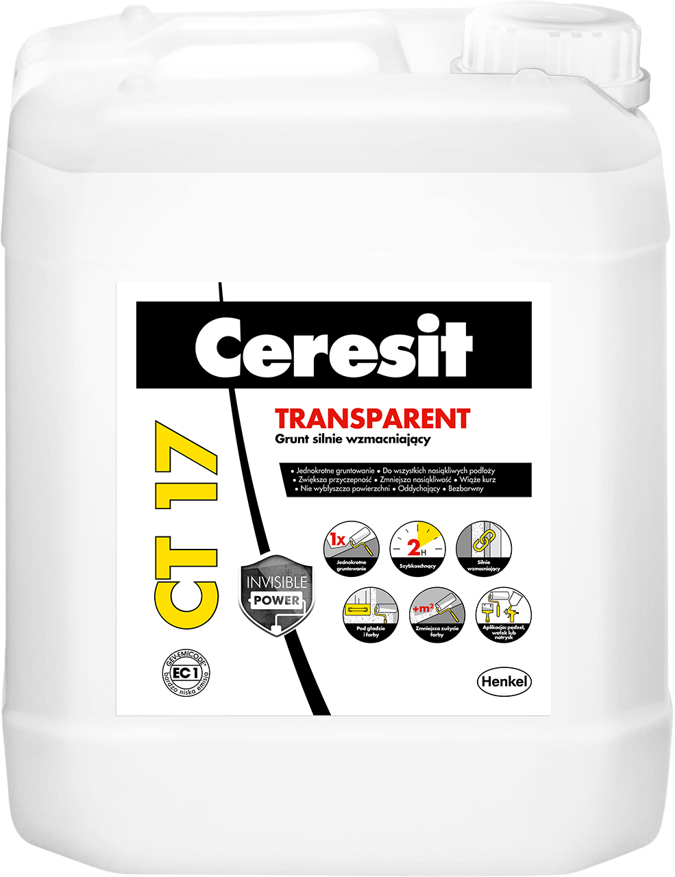 Preparat Ceresit CT 17 służy do gruntowania podłoży (ścian, podłóg, sufitów) wewnątrz i na zewnątrz budynków przed mocowaniem płytek ceramicznych, wylewaniem posadzek, mocowaniem wykładzin podłogowych, tapetowaniem, szpachlowaniem, malowaniem czy mocowaniem płyt izolacji termicznej. Grunt nie zawiera rozpuszczalnika. Zagruntowane CT 17 podłoża (wszelkiego rodzaju tynki, betony, jastrychy, podkłady z ogrzewaniem podłogowym) mają mniejszą nasiąkliwość, co zapobiega zbyt szybkiemu przesychaniu zapraw klejących, posadzek, szpachlówek czy farb. Preparat wnika w podłoże i wiąże ziarna kruszywa, nie powoduje jednak zwiększania parametrów wytrzymałościowych w całym przekroju podłoża. Stosowanie CT 17 szczególnie zalecane jest na podłoża gipsowe, anhydrytowe i gazobetonowe. Jest on odpowiedni także do gruntowania nieimpregnowanych płyt gipsowo-kartonowych. Preparat powoduje żółtawe zabarwienie podłoży. Do gruntowania podłoży pod tynki cienkowarstwowe stosować farbę gruntującą Ceresit CT 16 lub CT 15.