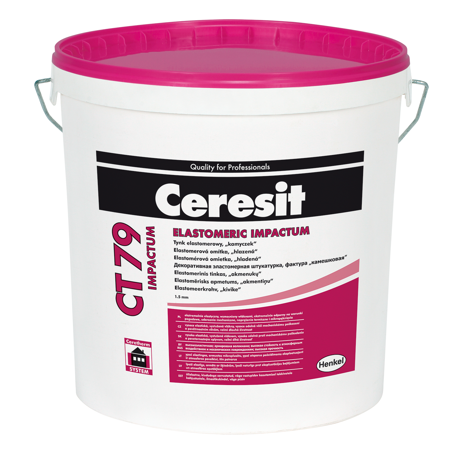 Gotowy do użycia tynk elastomerowy Ceresit CT 79, zalecany jest jako wyprawa elewacyjna w złożonych systemach ocieplania ścian zewnętrznych budynków z zastosowaniem płyt styropianowych oraz wełny mineralnej (ETICS) Ceresit Ceretherm. Tynk Ceresit CT 79 zalecany jest szczególnie do stosowania na przegrodach, gdzie wymagana jest wysoka odporność systemu na eksploatacyjne uszkodzenia mechaniczne (np. części cokołowe budynków, wjazdy do garaży, strefy parkowania, sąsiedztwo placów zabaw, itp.) oraz odporność na zabrudzenia. Tynk zachowuje elastyczność w znacznie szerszym zakresie temperatur niż tradycyjne tynki na bazie dyspersji akrylowych. Zawiera kombinację wyselekcjonowanych włókien węglowych, szklanych, poliakryloamidowych zwiększających odporność elewacji na uszkodzenia eksploatacyjne oraz uderzenia. Połączenie powyższych właściwości dyspersji elastomerowej i dodatków oraz wykorzystanie modyfikatorów silikonowych pozwala na ekstremalne zwiększenie trwałości wyprawy, podniesienie odporności na korozję biologiczną oraz zachowanie estetycznego wyglądu elewacji w długim okresie użytkowania. Tynk Ceresit CT 79 w systemie Ceresit Ceretherm Impactum może być stosowany w ciemnych i bardzo ciemnych kolorach ( kolorystyka Intense), których zastosowanie w oparciu o tynki tradycyjne (akrylowe, silikatowe itp.) jest w dużym stopniu ograniczone lub niemożliwe (rekomendowany współczynnik odbicia światła HBW: ≥ 5%). Tynk elastomerowy Ceresit CT 79 może być również stosowany do wykonywania cienkowarstwowych wypraw tynkarskich na podłożach betonowych, tradycyjnych tynkach, podłożach gipsowych oraz na płytach wiórowych, gipsowo-kartonowych itp.