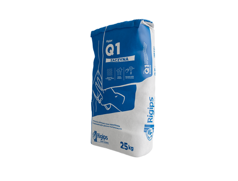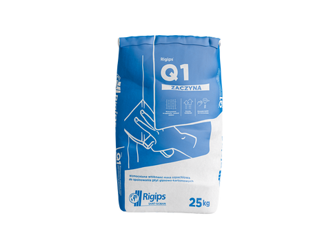 Rigips® Q1 Zaczyna to wzmocniona włóknami, gipsowa masa szpachlowa przeznaczona do spoinowania połączeń płyt gipsowo-kartonowych z użyciem fizelinowej lub papierowej taśmy zbrojącej. Może być również wykorzystana do szpachlowania naroży i miejsc mocowań, do wypełniania rys i ubytków oraz innych prac remontowych. Dodatek włókien wzmacnia masę, zmniejszając ryzyko powstawania spękań na łączeniach płyt gipsowo-kartonowych.
