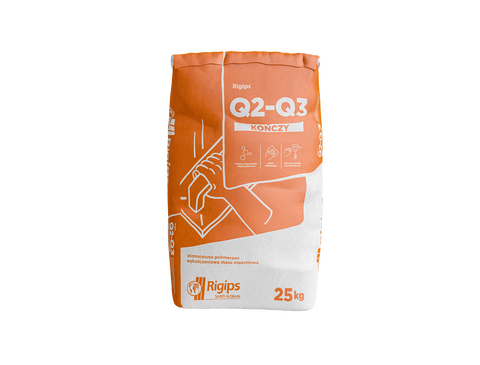 Rigips® Q2-Q3 Kończy to wzmocniona polimerami, gipsowa, wykończeniowa masa szpachlowa przeznaczona do wykonywania finalnej warstwy wykończeniowej na powierzchni płyt gipsowo-kartonowych w standardzie Q2 i Q3, po uprzednim zastosowaniu Rigips® Q1 Zaczyna. Masa może być również stosowana do całopowierzchniowego szpachlowania podłoży mineralnych takich jak tynki gipsowe, cementowo-wapienne. Do stosowania na ścianach i sufitach wewnątrz pomieszczeń. Dodatek polimerów wzmacnia masę, poprawiając wiązanie nawet w bardzo cienkiej warstwie, zapobiegając jej rozwarstwianiu.